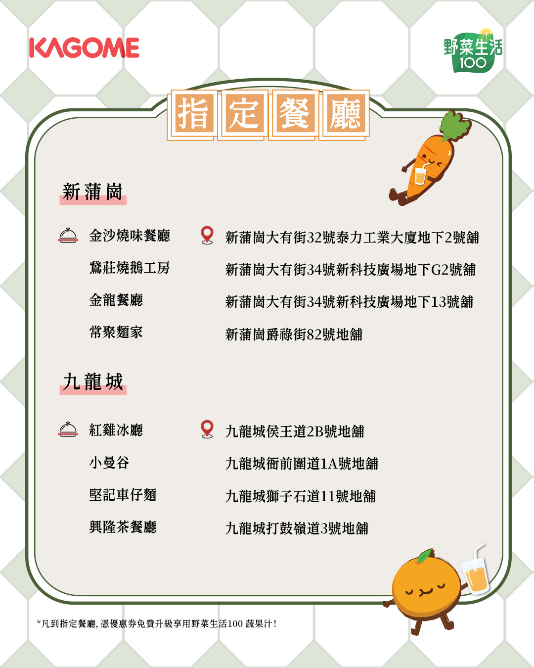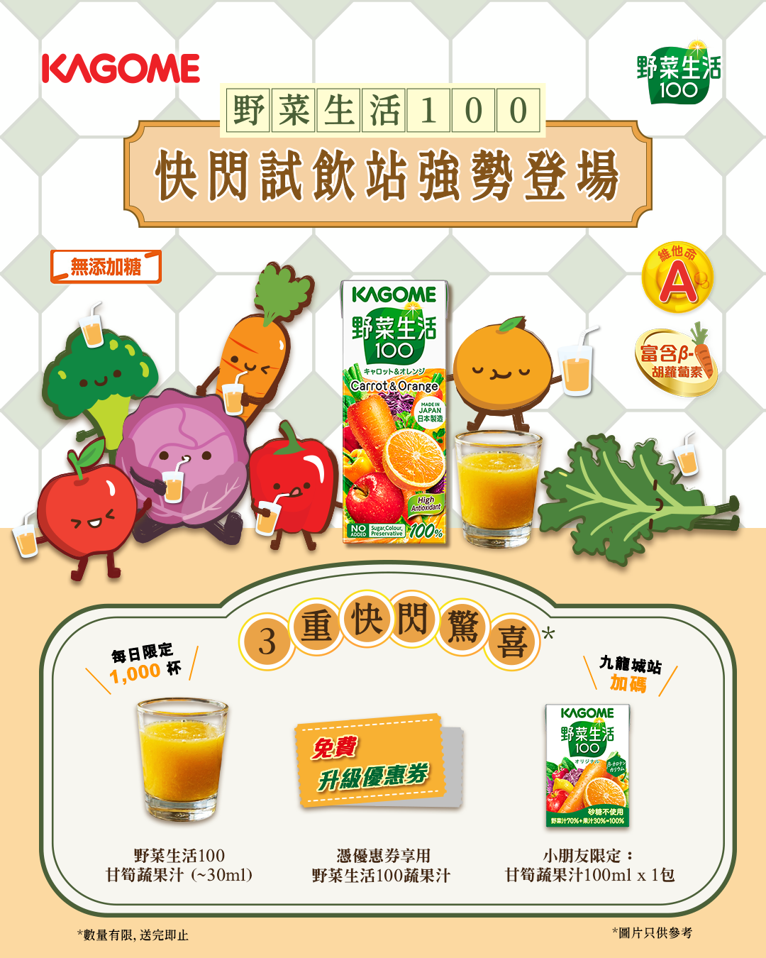 - 小朋友專屬驚喜(九龍城站限定):特別為小朋友額外贈送「甘筍蔬果汁100ml」乙包